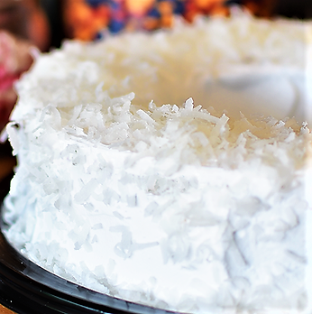 Pan de vainilla con mantequilla, betún de crema batida de vainilla, extra coco rallado, humectado con ron de coco.