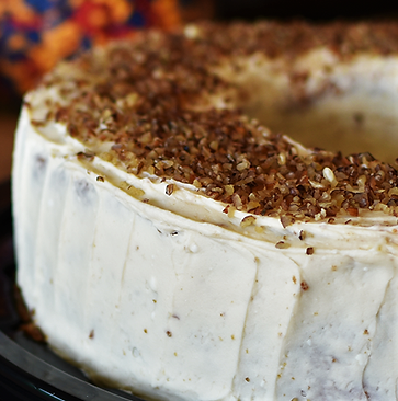 Pan de vainilla con mantequilla, betún de queso Philadelphia con mantequilla, nuez de Morelos, envinado con ron especiado.